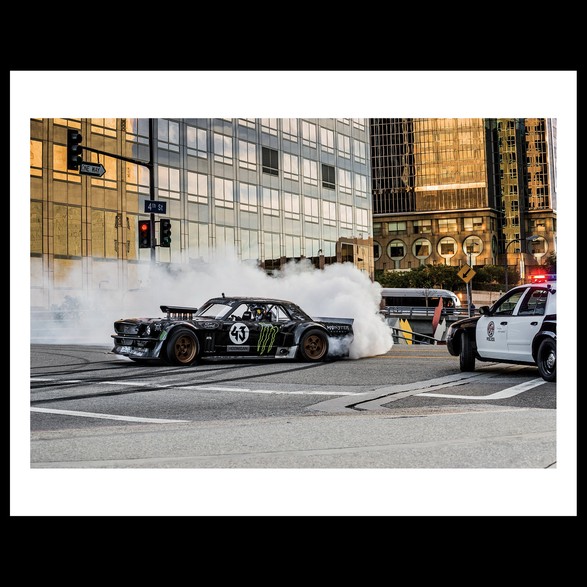 One of the greatest things about shooting Gymkhana, especially with the Hoonicorn - was that every turn, every transition was the opportunity for an amazing photo. This was shot during one of the first days of filming Gymkhana 7 in downtown LA, and was a transition shot. I always loved how Ken looked sliding around the corner near the cop car!